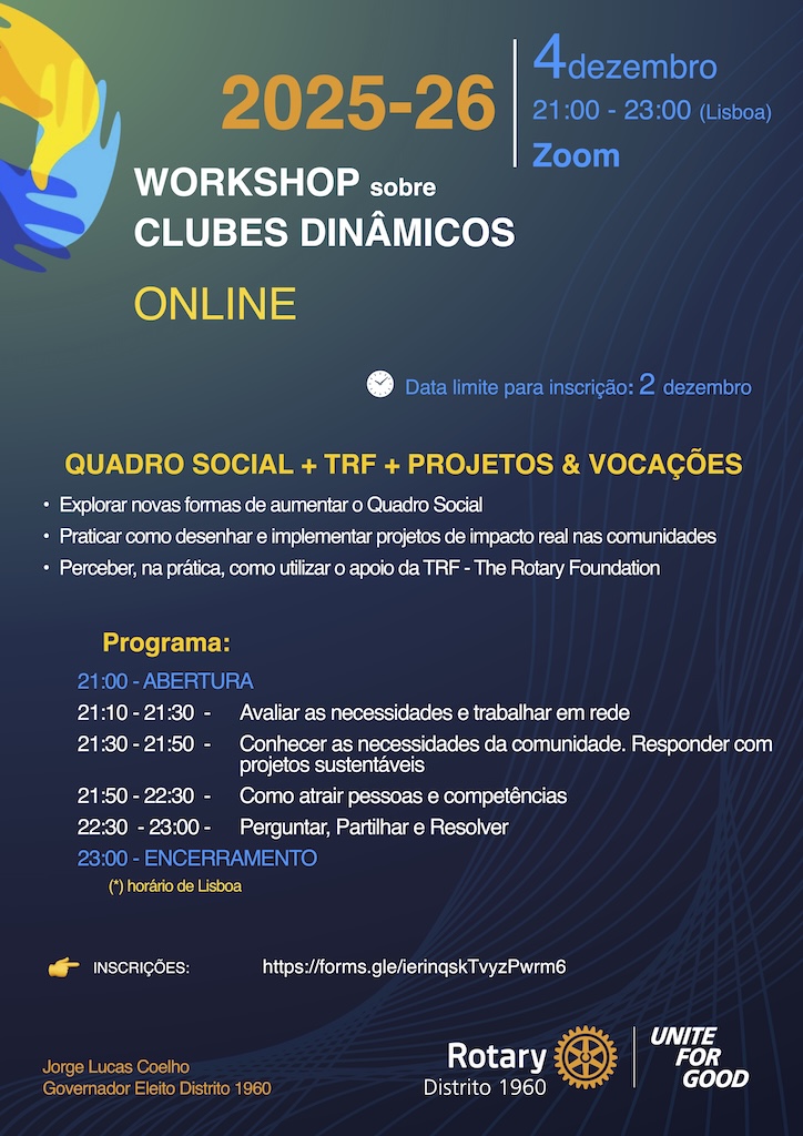 Recordo que o nosso Distrito, em linha com a sua missão formativa em áreas de grande relevância rotária, Desenvolvimento do Quadro Social, The Rotary Foundation (TRF) e Projetos de Impacto Comunitário, preparou um Workshop prático e interativo, a realizar no próximo dia 20 de setembro, às 9:30h, em Loures.