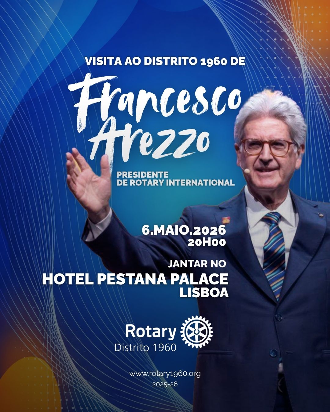 Integrado nas Comemorações do Centenário de Rotary em Portugal e no programa da visita ao nosso Distrito 1960, no dia 6 de maio, às 20:00h iremos realizar um jantar de celebração da visita, aberto a toda a família rotária portuguesa.O local escolhido foi o Hotel Pestana Palace, em Lisboa, onde na magnífica sala Valle Flôr teremos uma oportunidade única de conviver com o Presidente de Rotary International e sua esposa Anna, num encontro fraterno e significativo que irá reunir rotários, famílias e convidados.