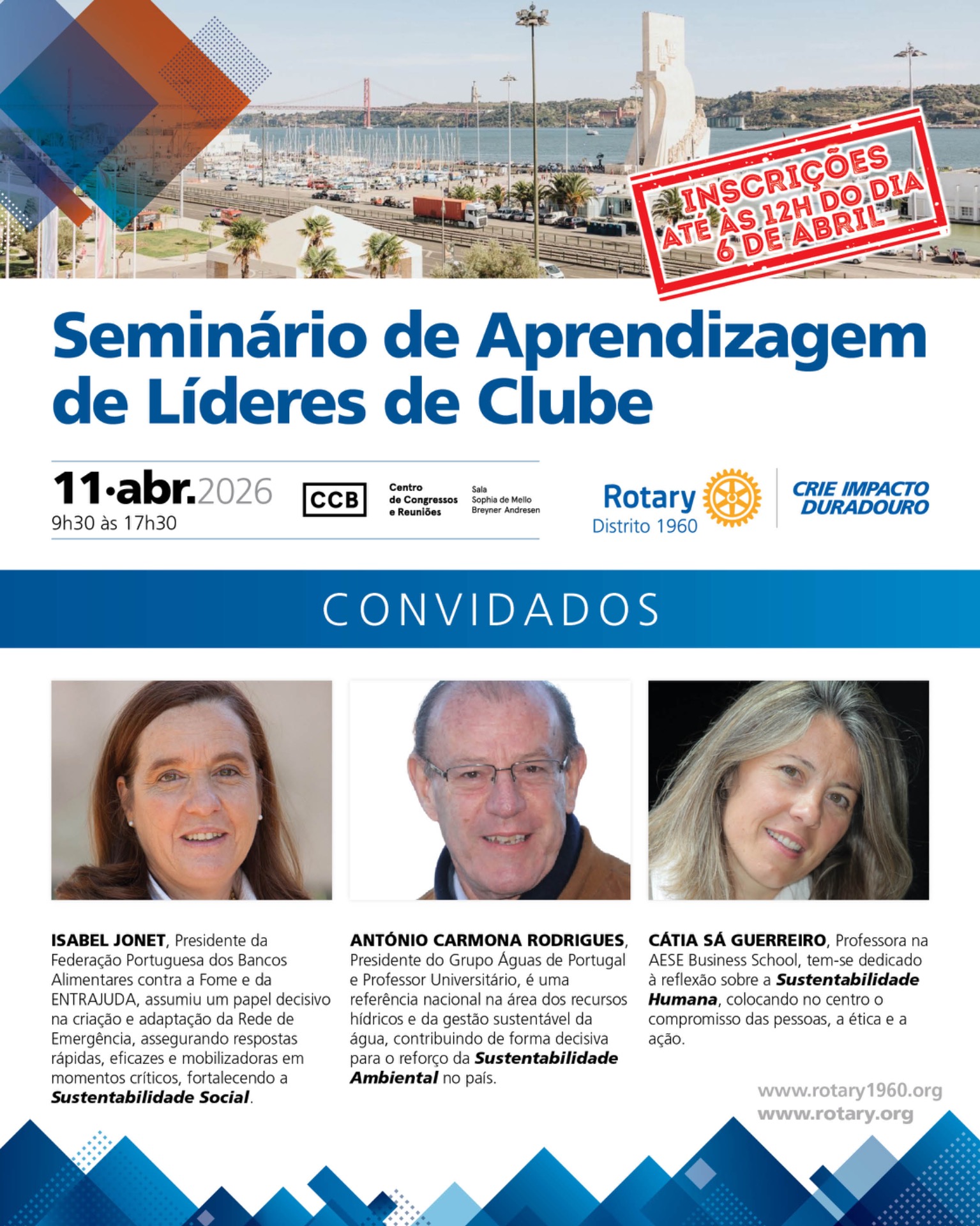 Este Seminário foi preparado com muito carinho, a pensar em cada um de vós. Como poderão ver no programa, para além dos momentos formativos e de divulgação de projetos, terão a oportunidade de escutar e inspirar‑se com os nossos convidados — Isabel Jonet, António Carmona Rodrigues e Cátia Sá Guerreiro — que nos ajudarão a refletir sobre diferentes dimensões da sustentabilidade, orientação estruturante do próximo ano rotário. Contaremos também com a atuação da Tuna Académica do IADE, um momento de boa disposição e energia, e uma interpretação de música clássica, por uma bolseira de Rotary.