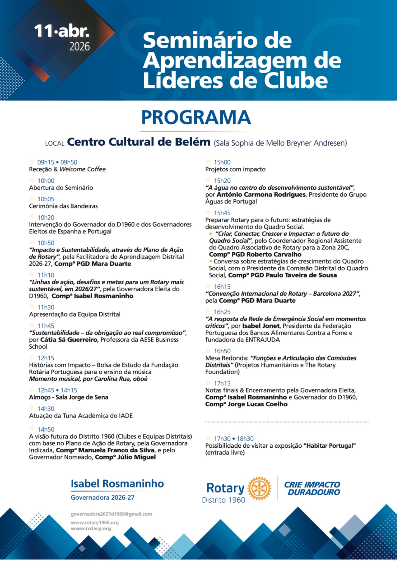 No dia 11 de abril, no Centro Cultural de Belém (CCB), terá lugar o Seminário de Aprendizagem de Líderes de Clubes, destinado a todos os sócios dos nossos Clubes.
